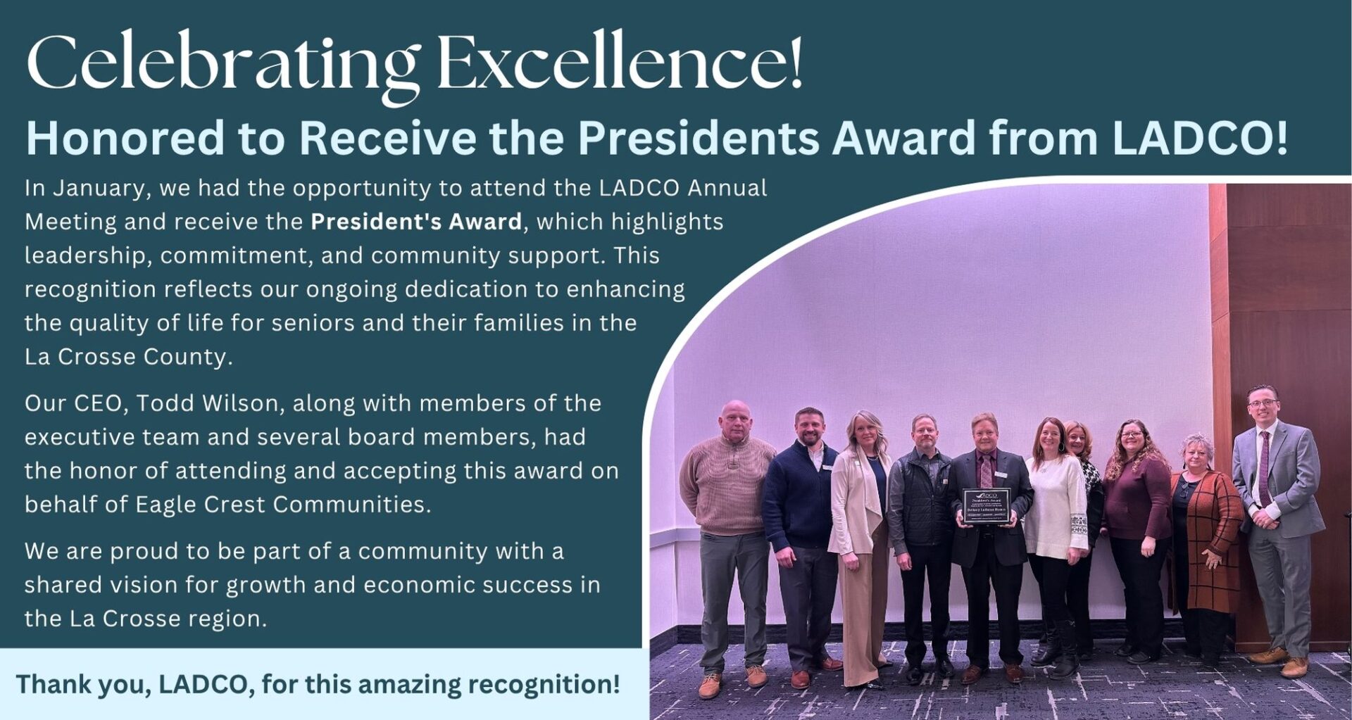 We’re honored to have received the LADCO President’s Award, which recognizes leadership, commitment, and community support in the La Crosse region. This meaningful recognition reflects our dedication to enhancing the quality of life for seniors and supporting the broader community we’re proud to be part of.