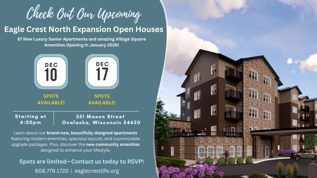 Join us at Eagle Crest North for an informative session on our brand new expansion! 351 Mason St Onalaska, WI 54650 *All open houses start at 4:00pm. Please allow an hour.