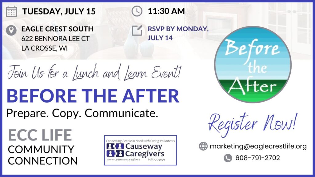 Join us for a Lunch & Learn with Sara Wrobel, Executive Director of Causeway Caregivers! Enjoy a complimentary meal while learning about her “Before the After” program, which helps individuals of all ages plan and share their final wishes. Don’t miss this chance to get expert advice and answers to your questions!