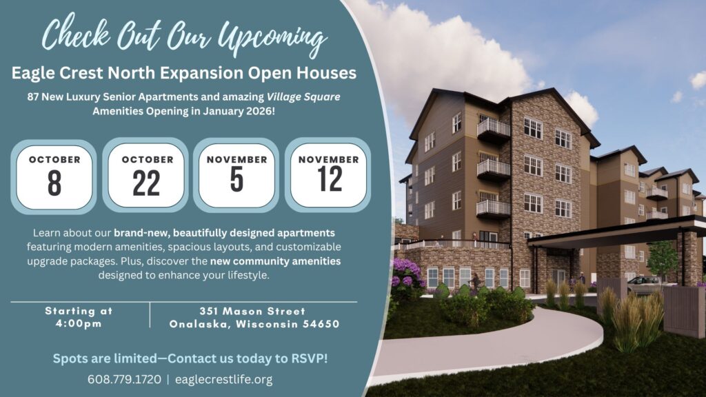 You’re invited to explore the future of senior living at Eagle Crest North in Onalaska! Opening in January 2026, our 87 new luxury apartments will offer modern one- and two-bedroom floor plans with sunrooms or dens, quartz countertops, upscale appliances, and bright living spaces with large windows and fireplaces. Plus, discover our exciting new amenities, including a virtual sports lounge, woodworking shop, rooftop firepit, and more!